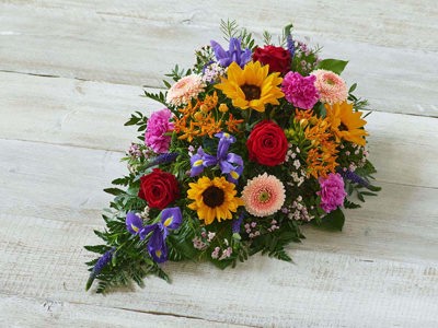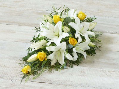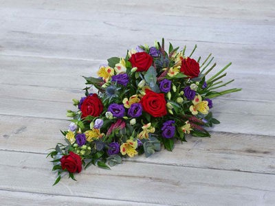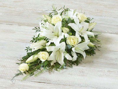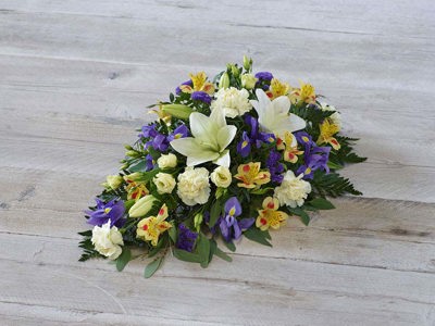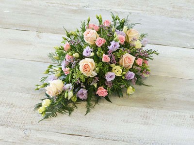 A delicate mix of blooms including roses, lisianthus and scented silvery rosemary. Arranged in a teardrop shape suitable for smaller coffins.