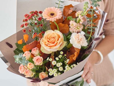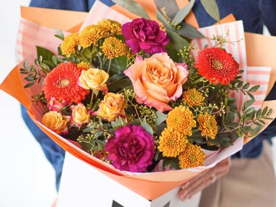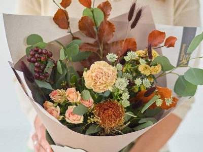 A bouquet handcrafted to capture the amazing colour autumn can bring. Expect to see blooms in shades of ruby, amber, mustard and plum with pops of purple, blue and peach. Lily Free options also available.