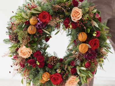 Make theirs a wreath to remember. This gorgeous Christmas door wreath will be packed with fresh festive flowers, expertly arranged and delivered with care by their local florist. It'll feature fresh blooms in shades of red and green, with peach and cream highlights and pops of burgundy and cerise.