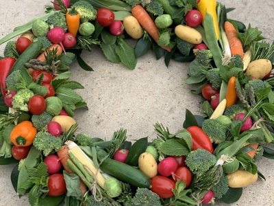 A beautiful wreath of mixed vegetables to mark a fond memory. We can create this beautiful memory wreath with any items you wish. Mixing fruit, vegetables, flowers and bulbs.